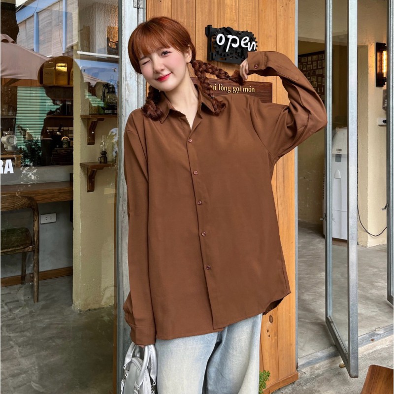 Áo Sơ Mi Nữ Form Rộng Dài Tay Cotton Lụa Hàn Unisex Màu Nâu Cực Xinh - 539.4