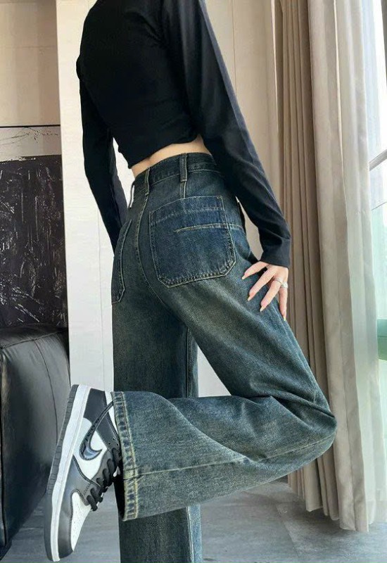 HƯỚNG DẪN MUA HÀNG : Quần Jean Nữ Ống Rộng Lưng Cao Màu Xanh Wash Bụi Túi Kiểu Phong Cách Retro 463
