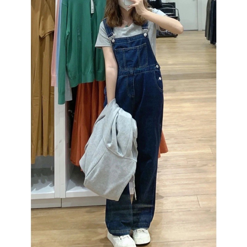 Yếm Quần Jean Nữ Ống Rộng Màu Xanh Đậm Form Dài Phối Túi Trước Ngực Phong Cách Ulzzang 461.2